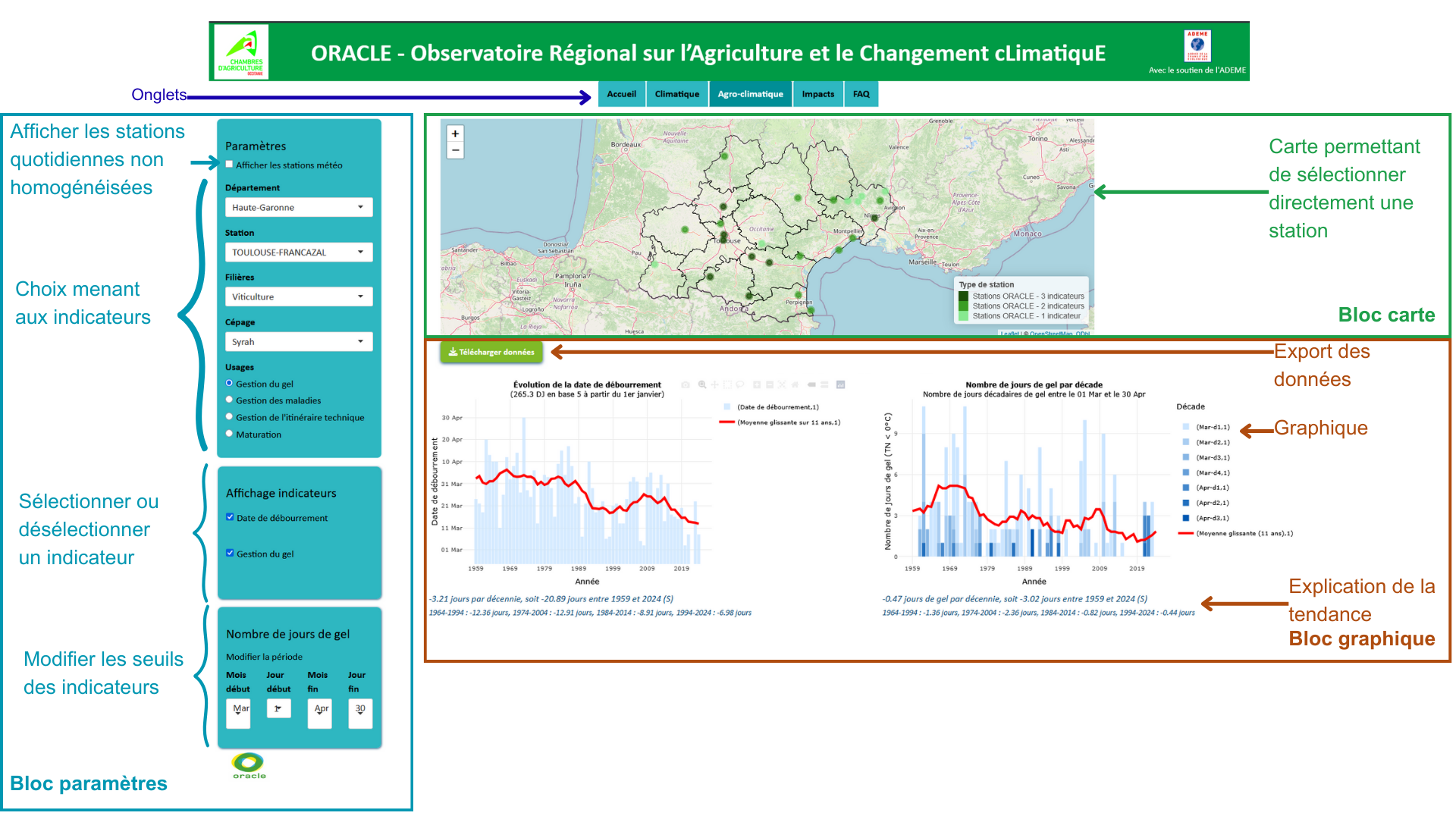 Ainsi, les onglets « Climatique » , « Agro-climatique » et « Impacts » sont composés de trois blocs distincts :